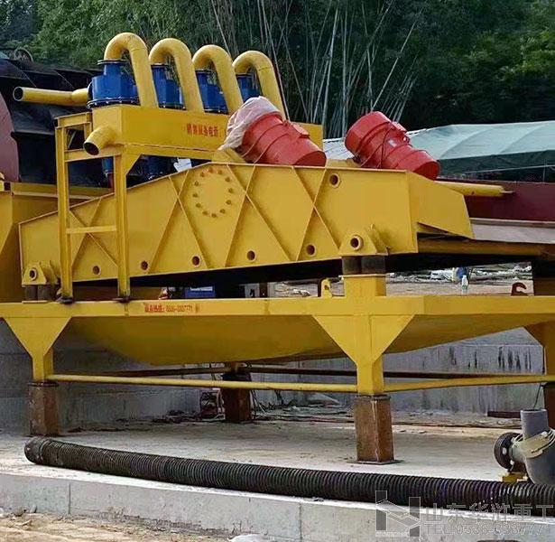 泥浆水流入清洗槽,通过耐磨泵将泥浆水送入高压分离器把污水和砂分离、砂经喷头到脱水筛,脱水后送走。